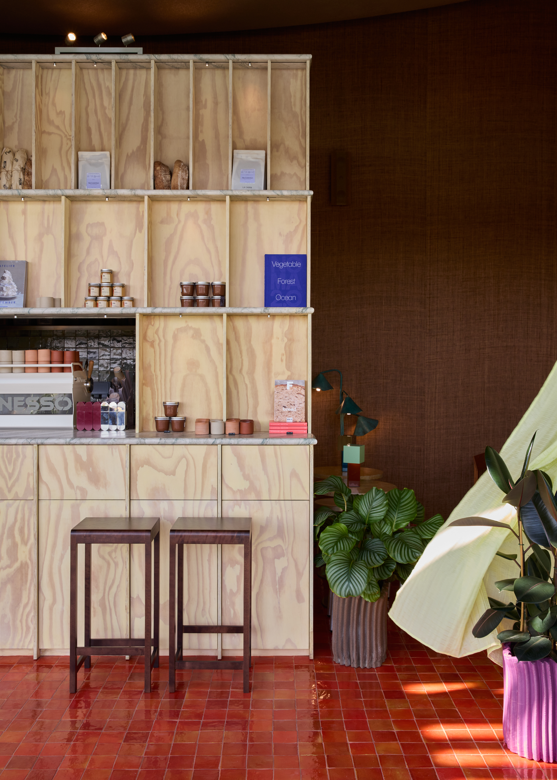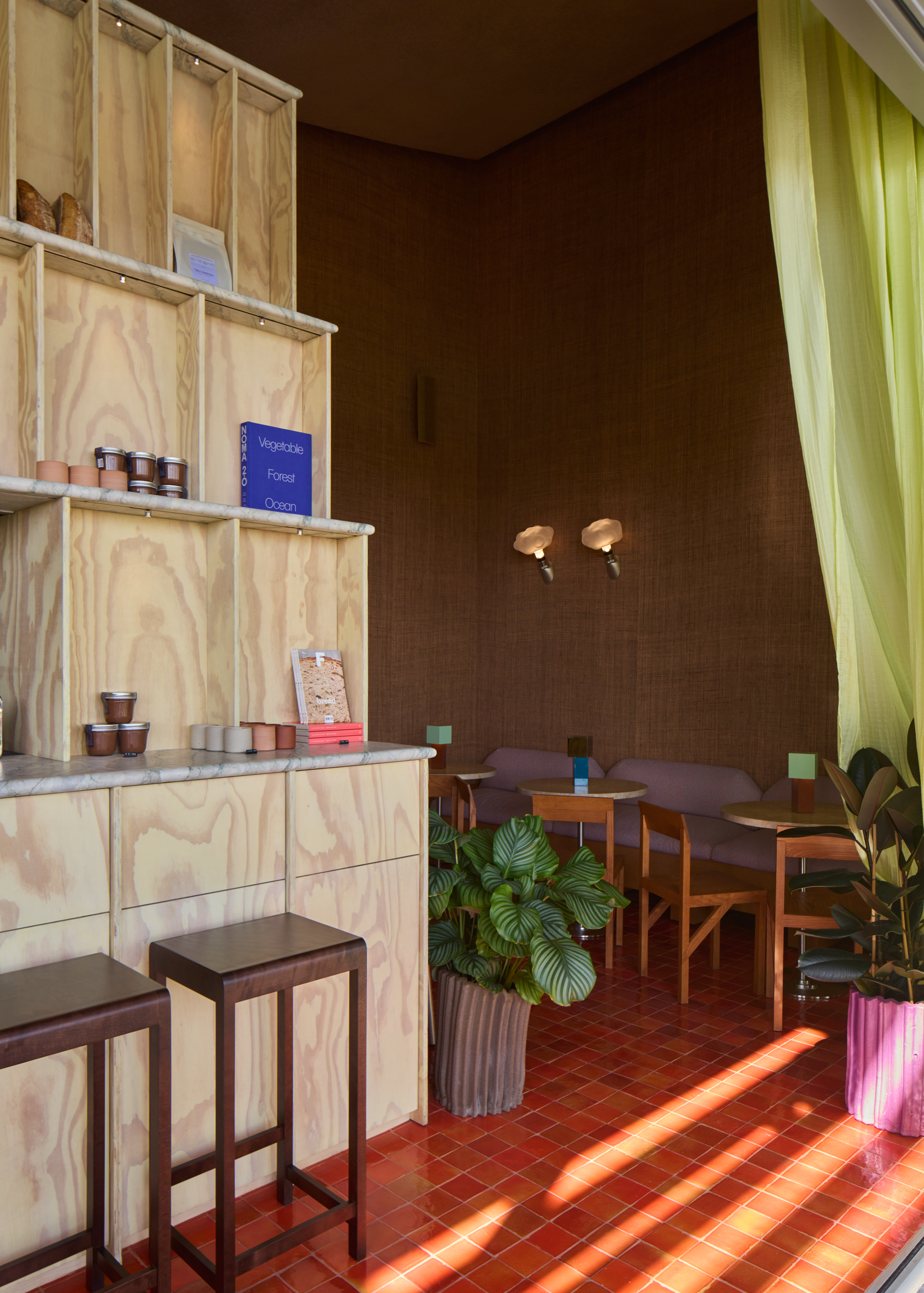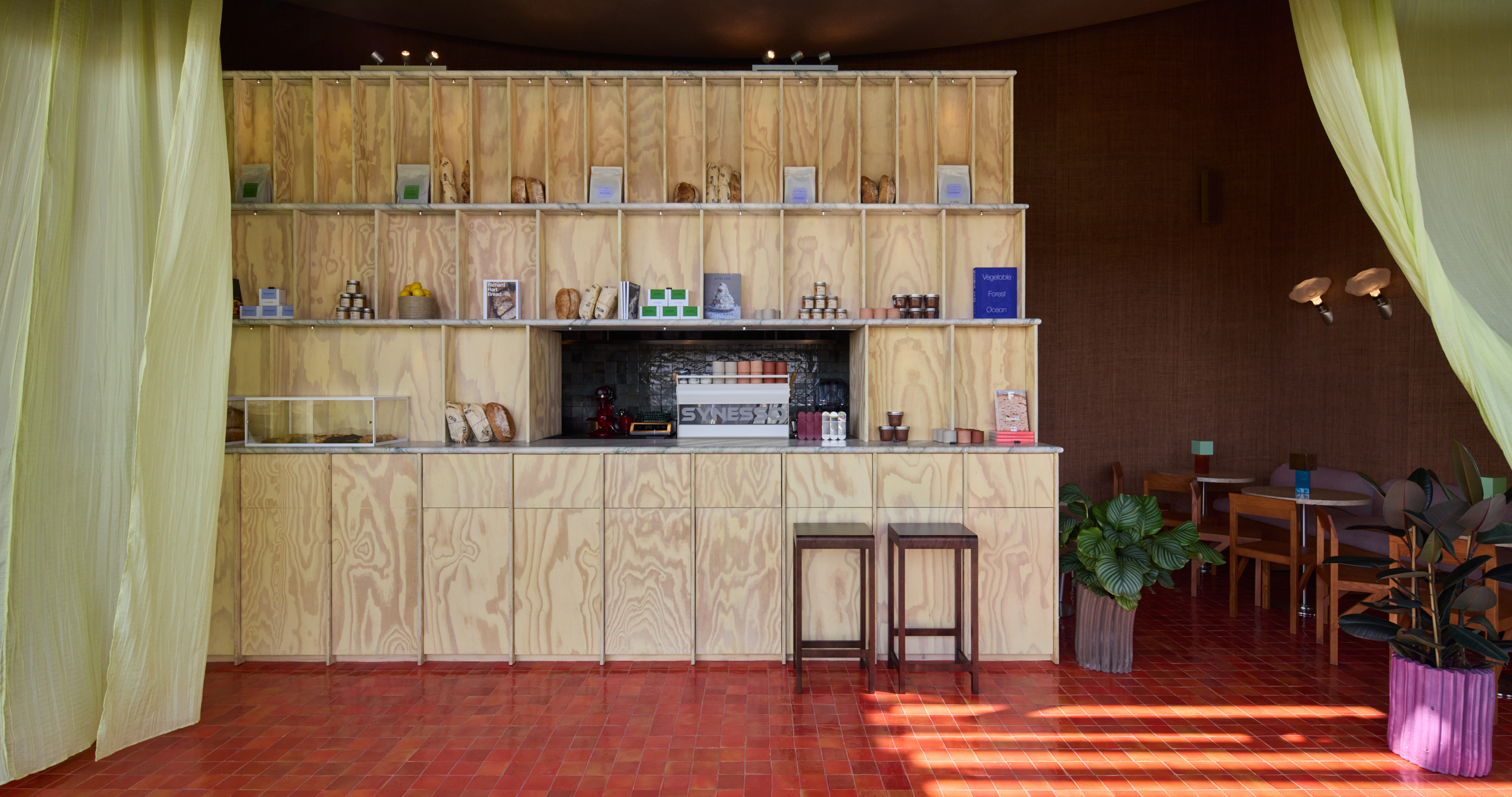 A linear counter anchors the layout, with open shelving that frames loaves, books, and goods as part of the architecture. Pale plywood with expressive grain sets the backdrop, balanced by marble counters, dark glazed tiles, and terracotta-red flooring that reflects light with warmth. Lime-green drapery softens the edges, filtering daylight into gentle layers.