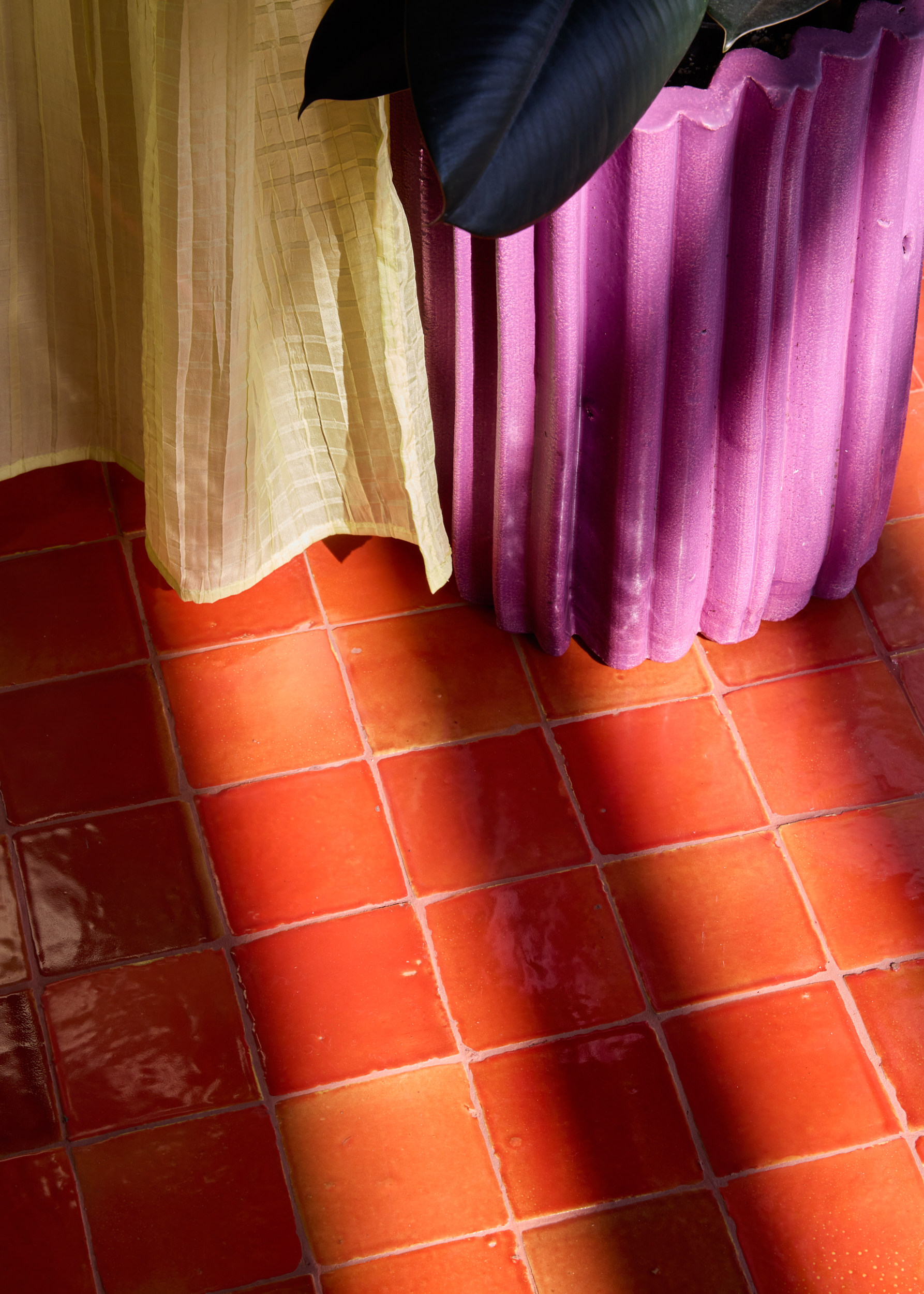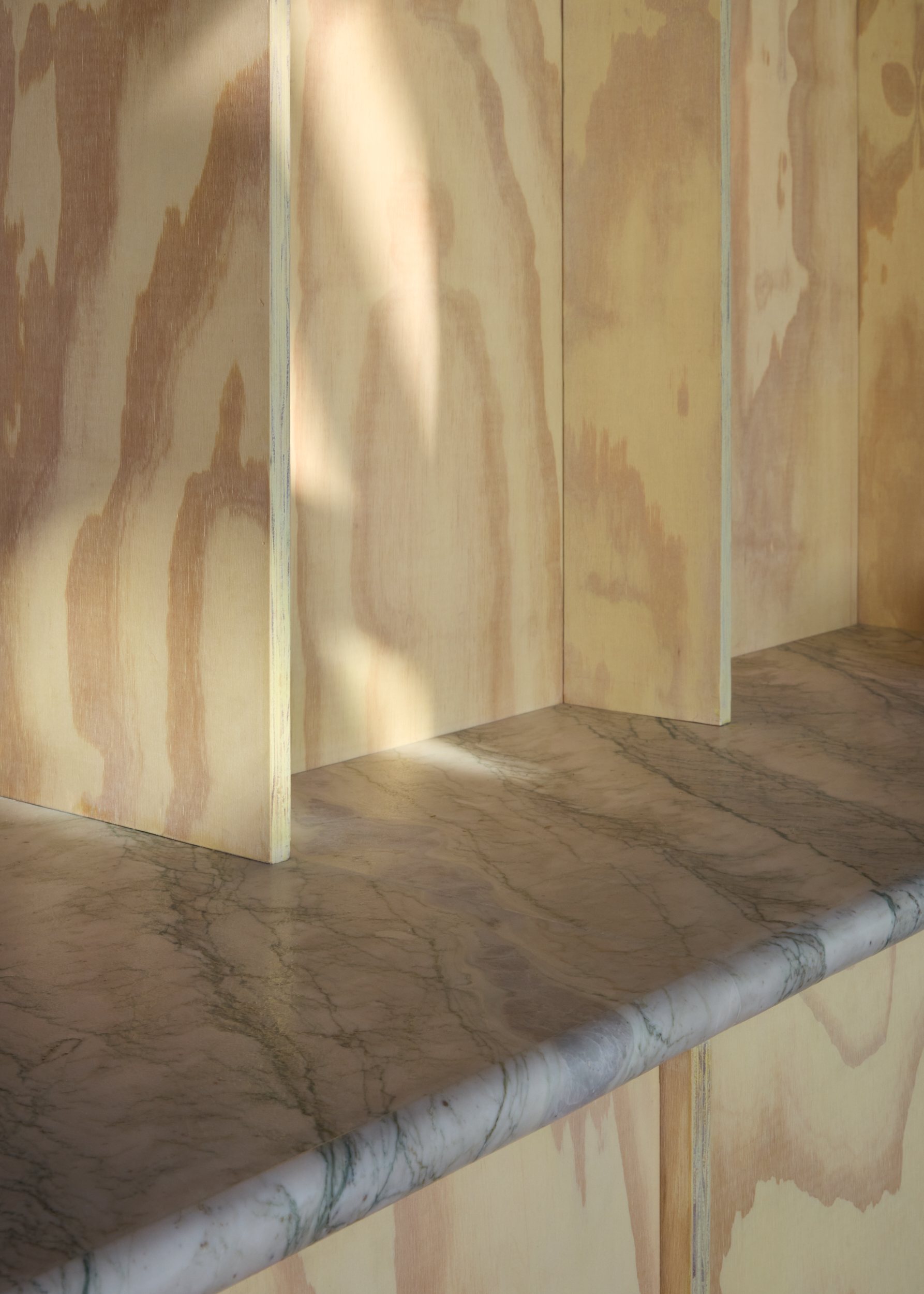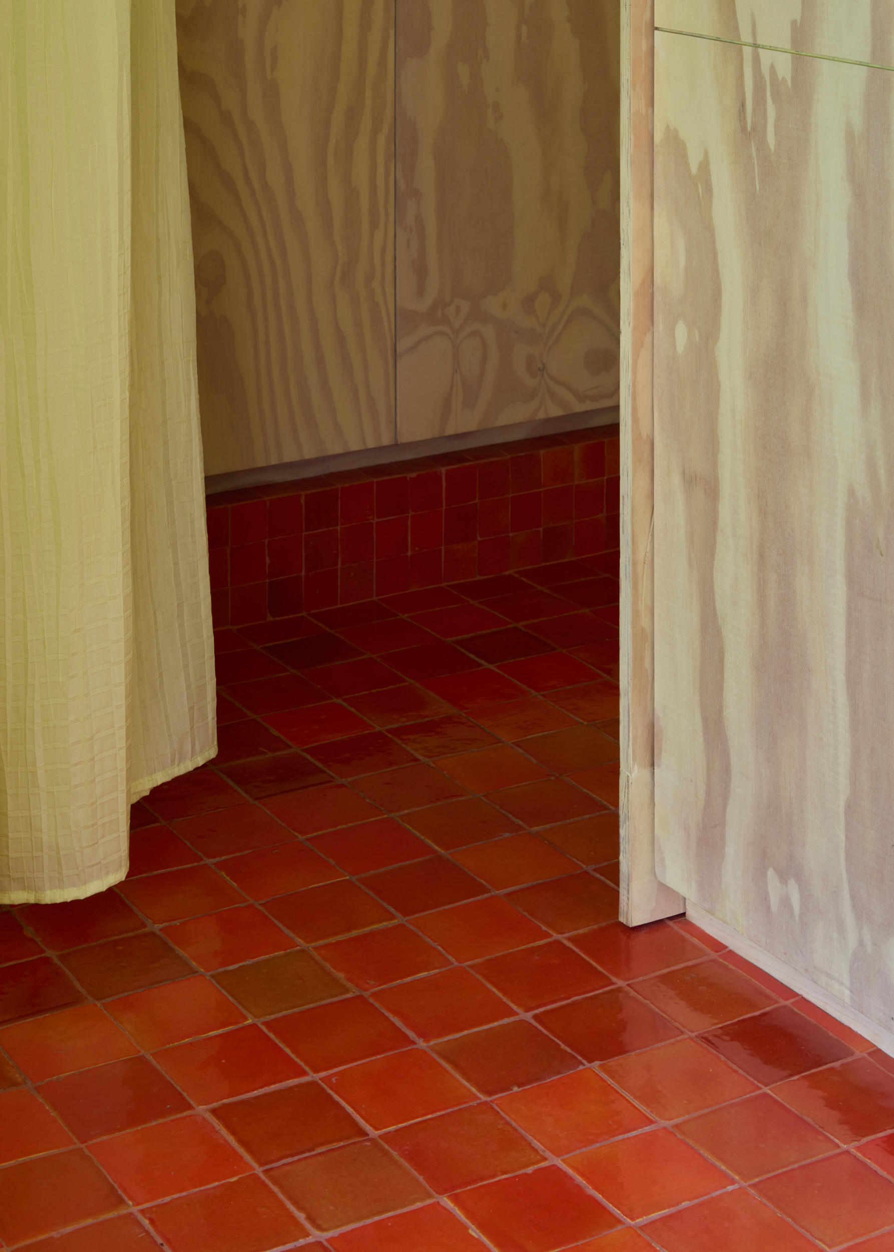 A linear counter anchors the layout, with open shelving that frames loaves, books, and goods as part of the architecture. Pale plywood with expressive grain sets the backdrop, balanced by marble counters, dark glazed tiles, and terracotta-red flooring that reflects light with warmth. Lime-green drapery softens the edges, filtering daylight into gentle layers.