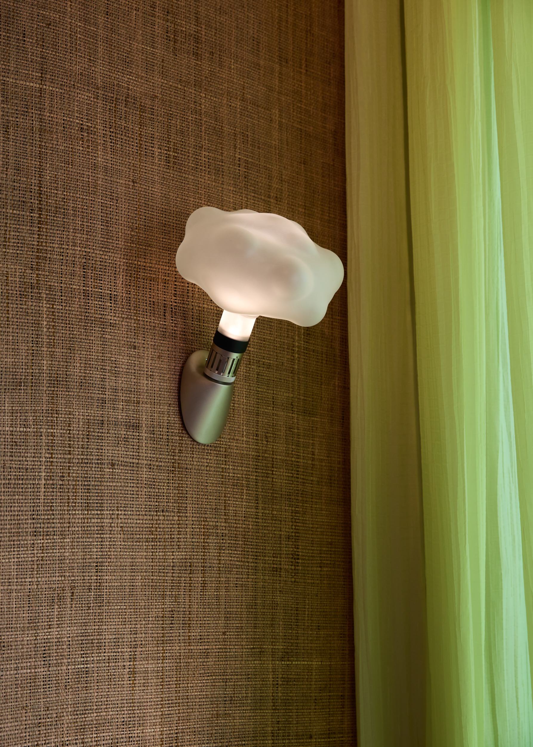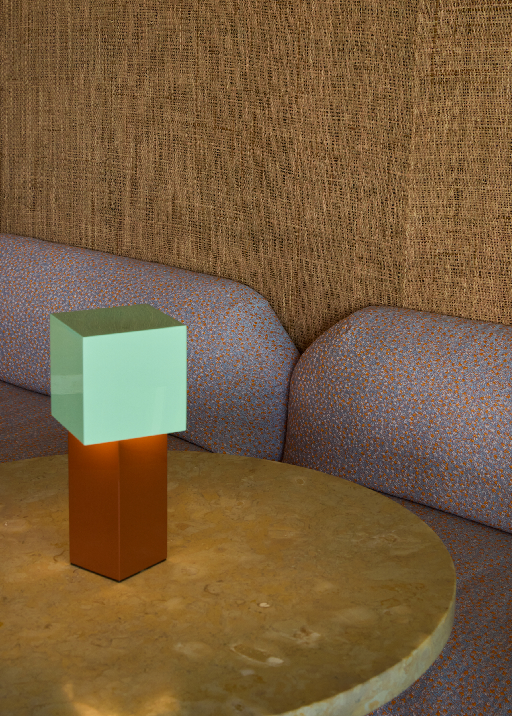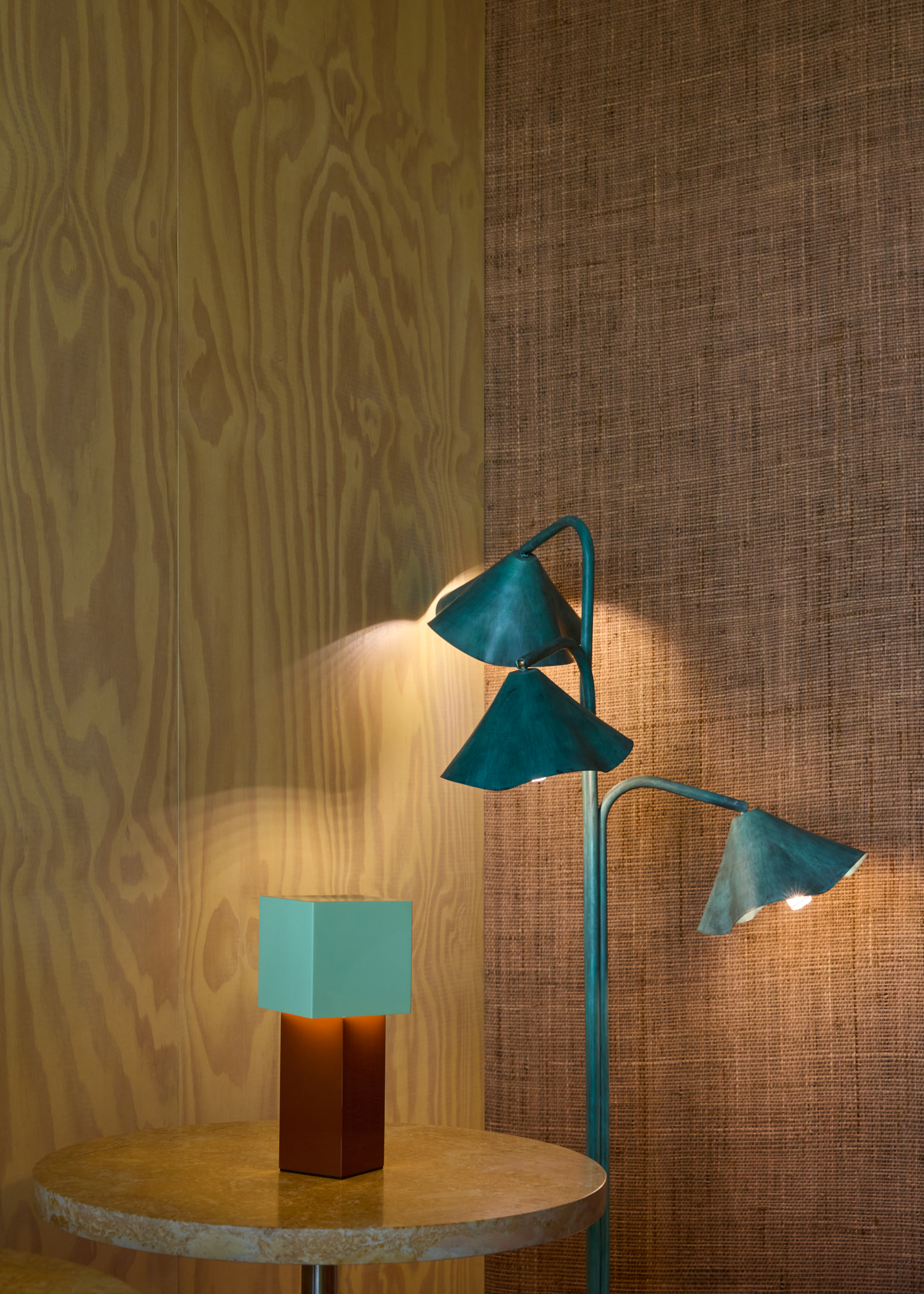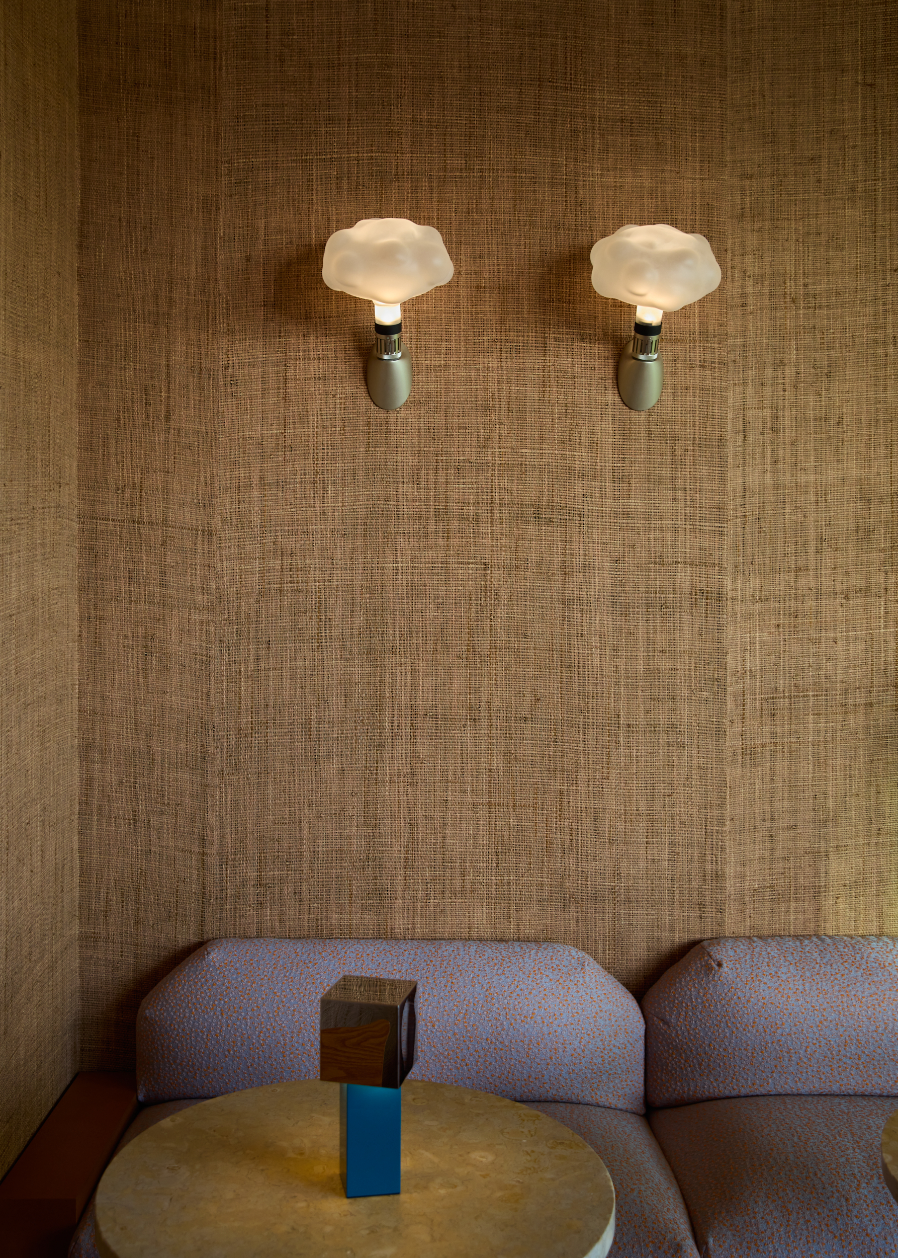 The seating area combines marble-topped tables, geometric timber chairs, and upholstered benches with sculptural lighting—cloud-like sconces, jewel-toned table lamps—that create pockets of intimacy. Lush plants punctuate the space, reinforcing a dialogue of color and texture.